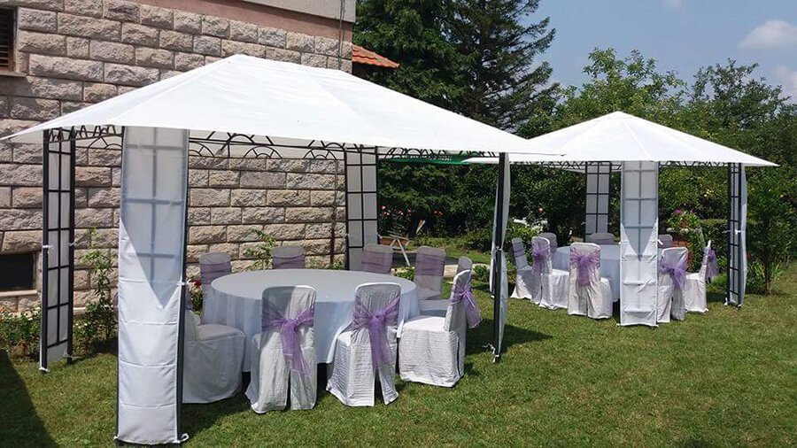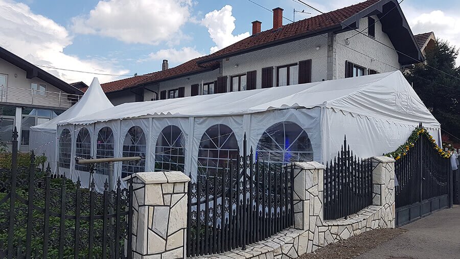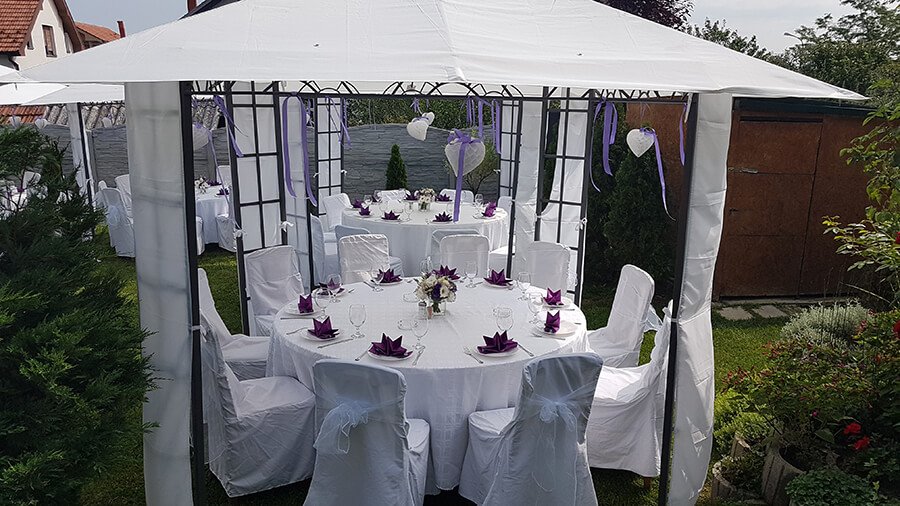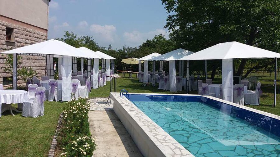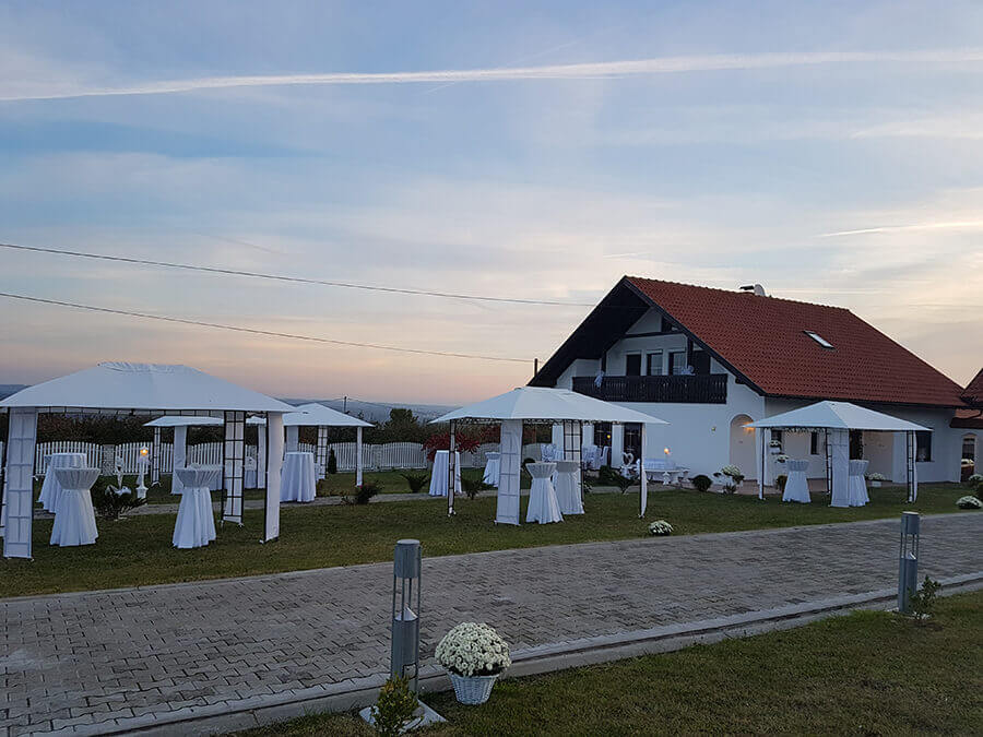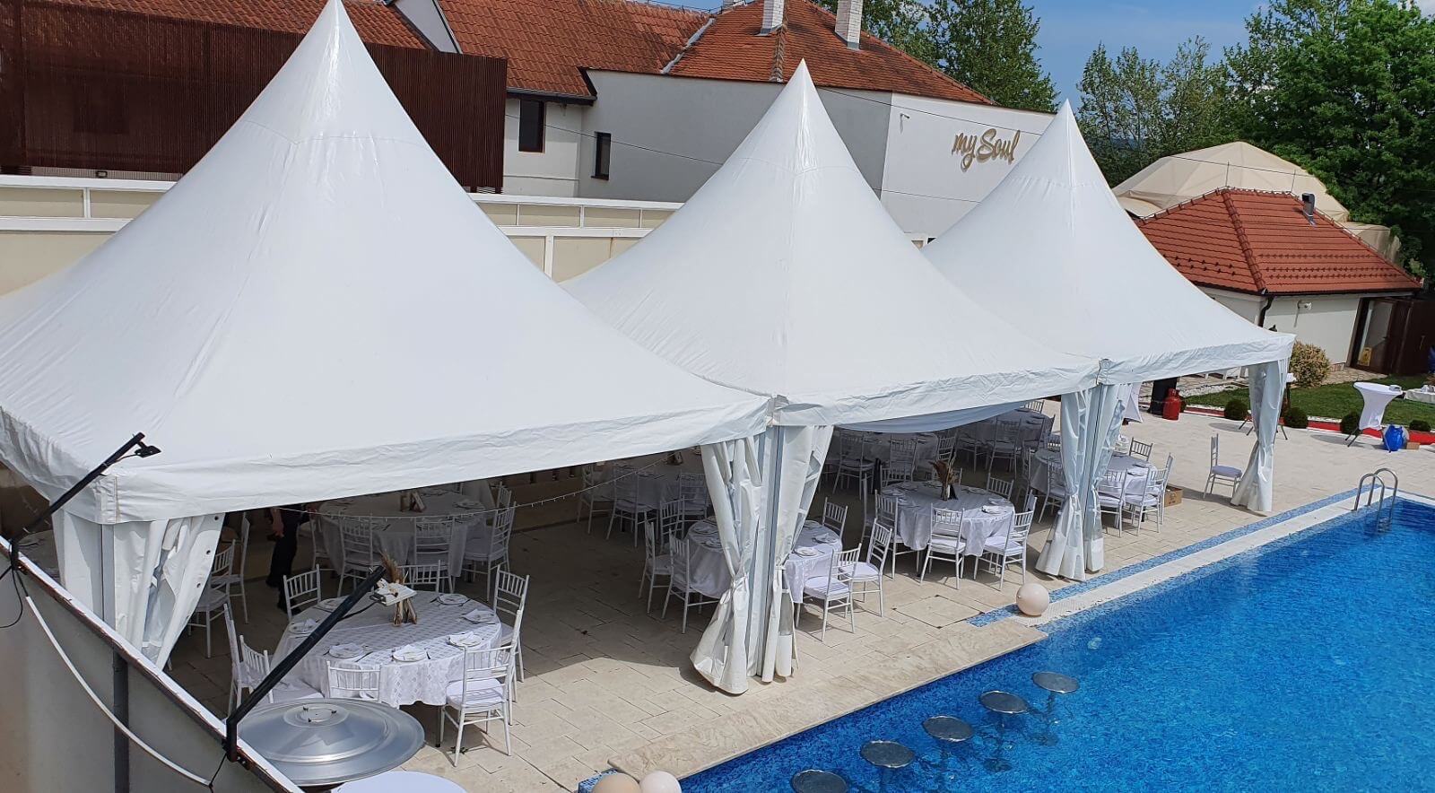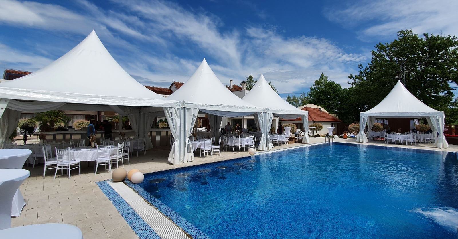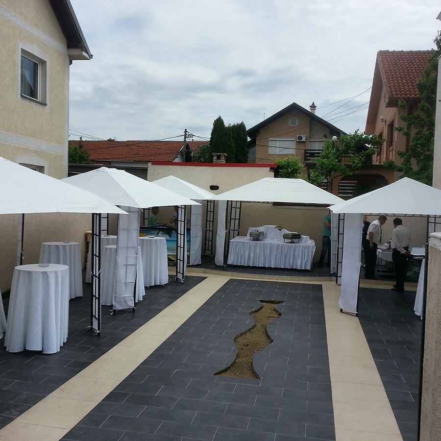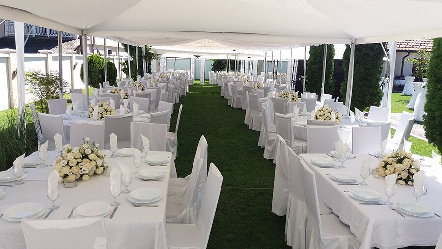 U ponudi su kvalitetni, elegantni, beli šatori, modernog dizajna, čija je dužina prilagodljiva Vama i Vašim potrebama, kao i mogućnostima prostora na kome želite da postavite šator. Kapaciteti šatora su od 80 do 220 sedećih mesta. Svi šatori se mogu urediti i dekorisati prema vašim željama.