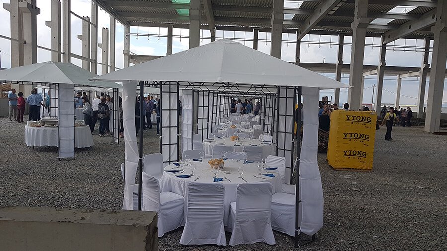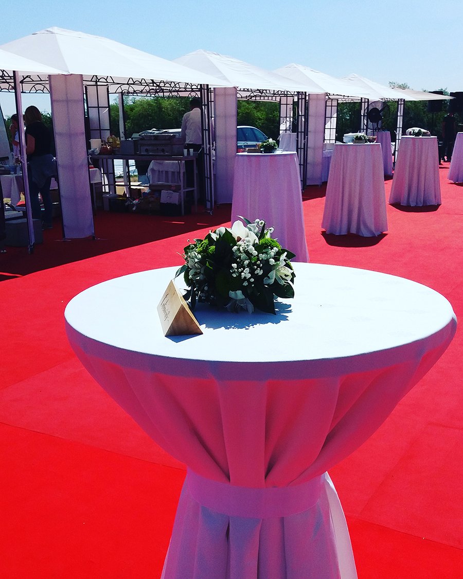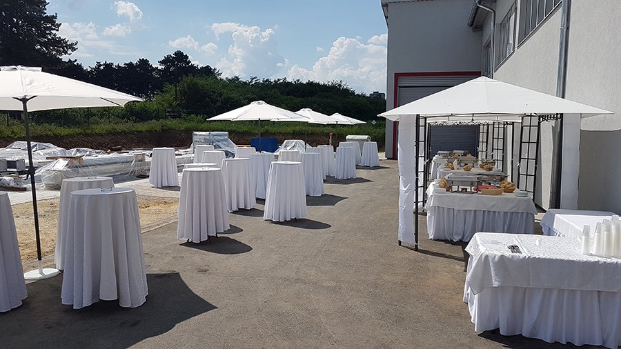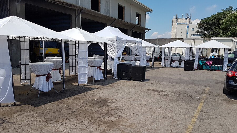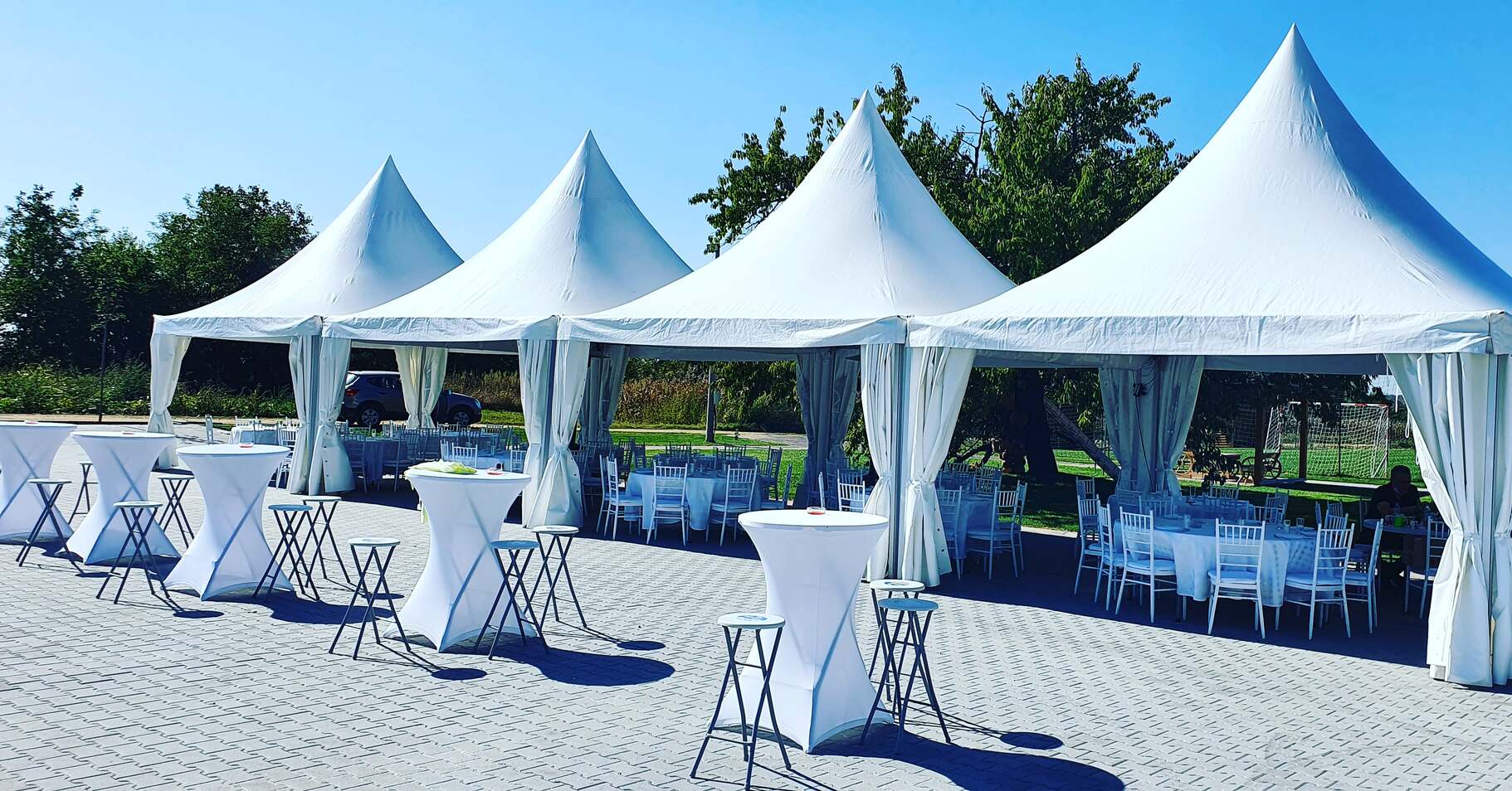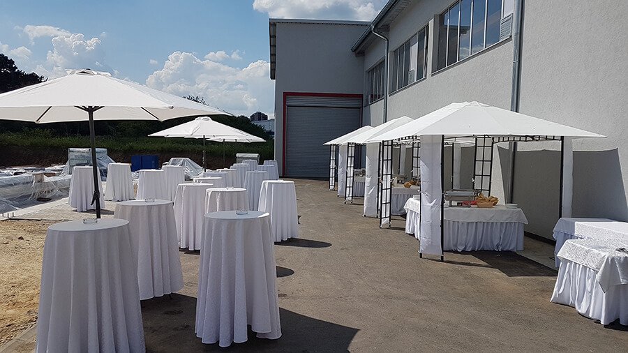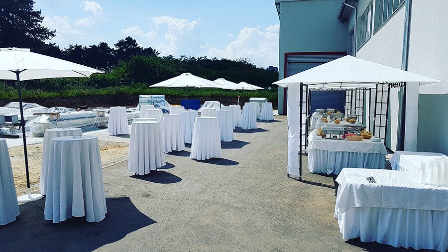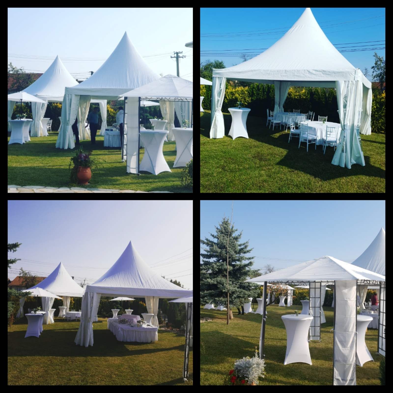 U ponudi su kvalitetni, elegantni, beli šatori, modernog dizajna, čija je dužina prilagodljiva Vama i Vašim potrebama, kao i mogućnostima prostora na kome želite da postavite šator. Kapaciteti šatora su od 80 do 220 sedećih mesta. Svi šatori se mogu urediti i dekorisati prema vašim željama.